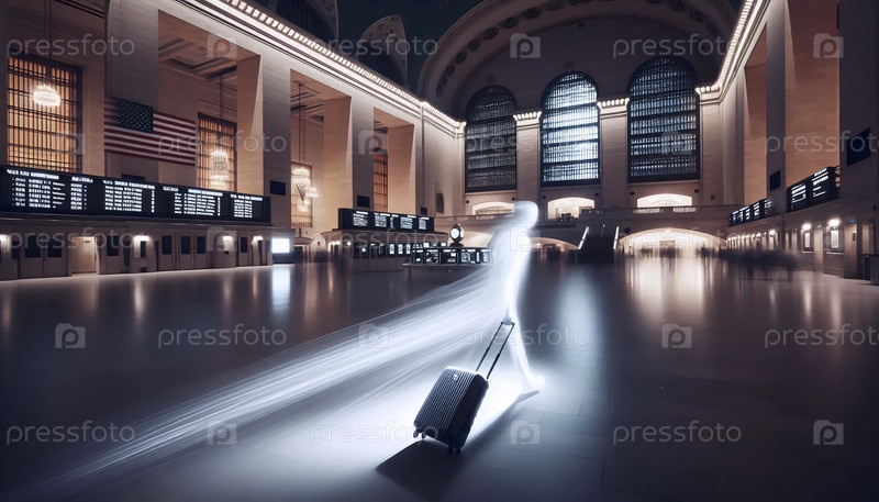 Фотография с длительной экспозицией фигуры, тянущей чемодан через железнодорожный вокзал, Ай создала изображение