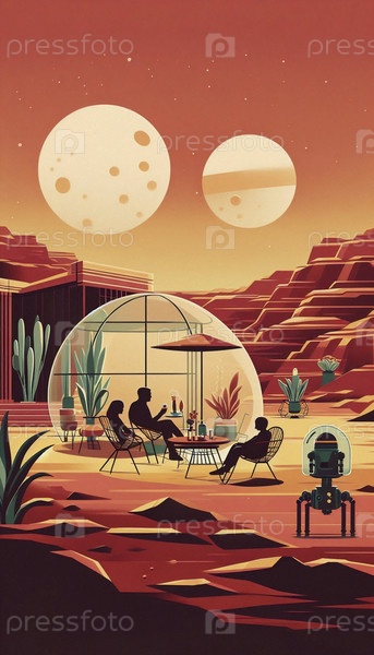 Ретро-футуристическая семья наслаждается заходящим солнцем на пикнике на их марсианском крыльце, Ai generated image