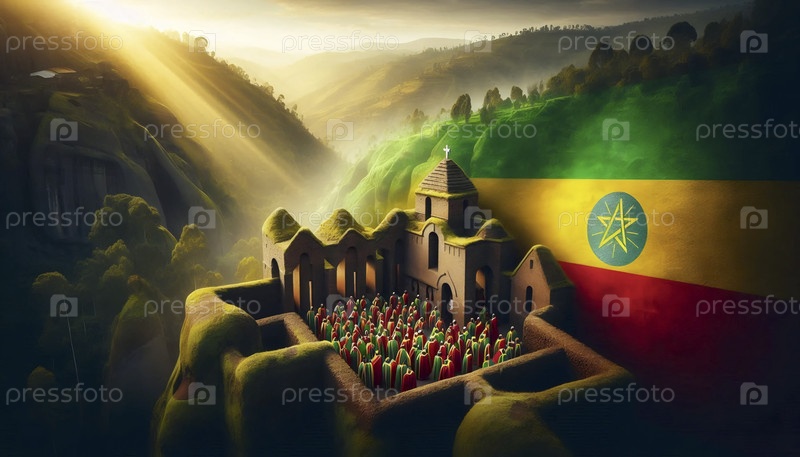 Эфиопский флаг в древних церквях, высеченных в скале Лалибелы, Ai generated image