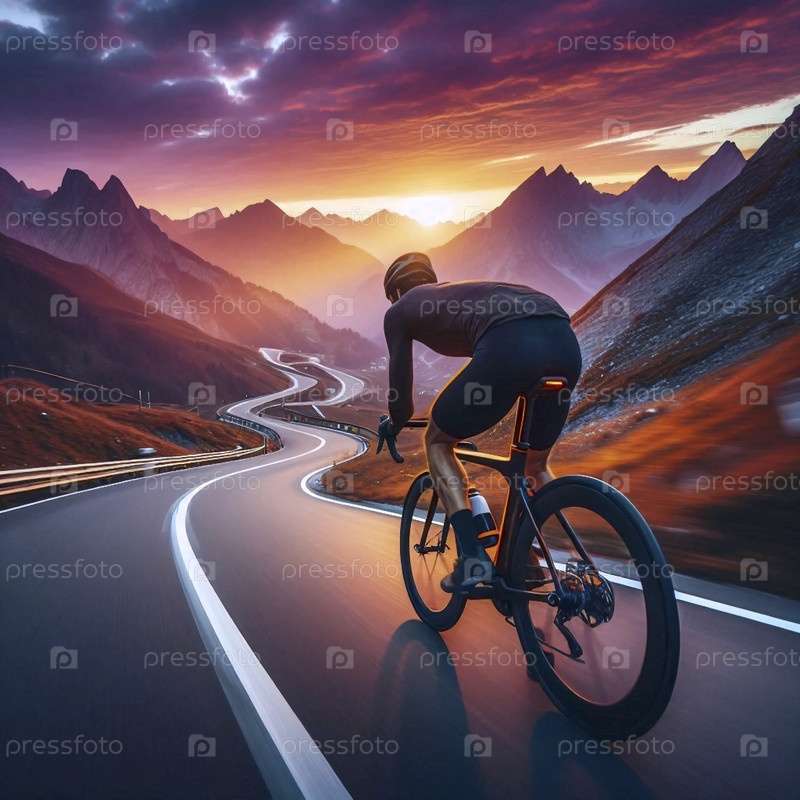 Приключенческий велосипедист покоряет извилистую горную дорогу на закате, оглядываясь назад, Ai generated image