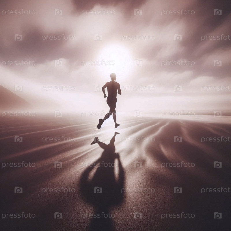 Силуэт одинокого бегуна на туманном пляже при восходе солнца, олицетворяющий свободу и энергию, Ай создал изображение