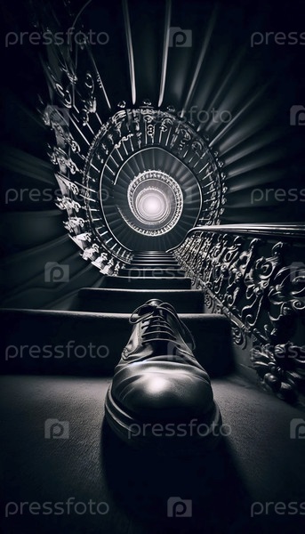 Низкоугольный снимок, смотрящий вверх по лестнице, обувь на переднем плане, Ай создал изображение