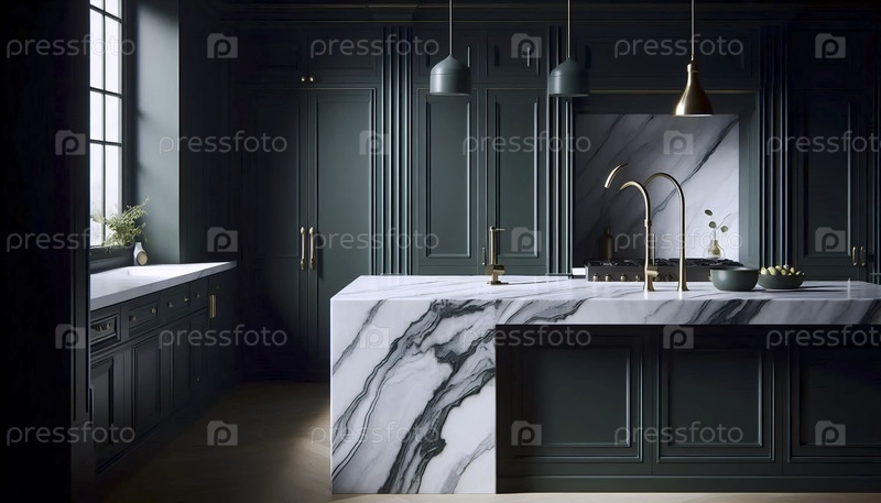 Настроенная темно-зеленая кухня с латунистыми акцентами, Ai generated image