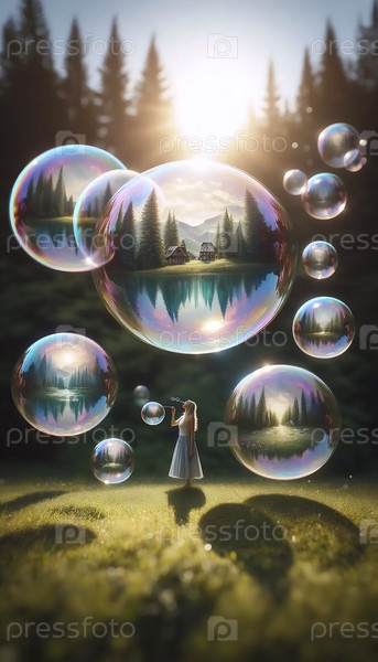Мыльные пузыри, содержащие пейзажи акварели, Ai generated image