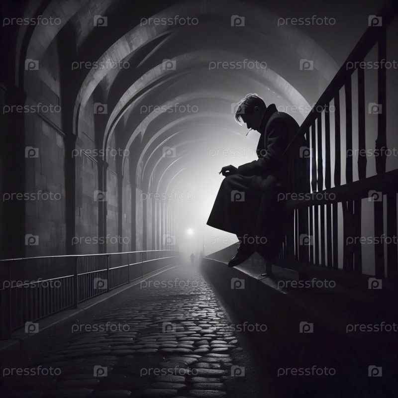 Человек, сидящий на перилах моста в сумерки, Ai generated image