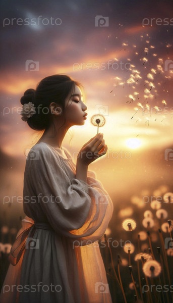 Принцесса, делающая желание на одуванчике акварельный арт-принт, Ai generated image