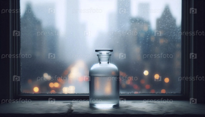 Одинокий макет пустой бутылки с парфюмом на туманном подоконнике, Ai generated image