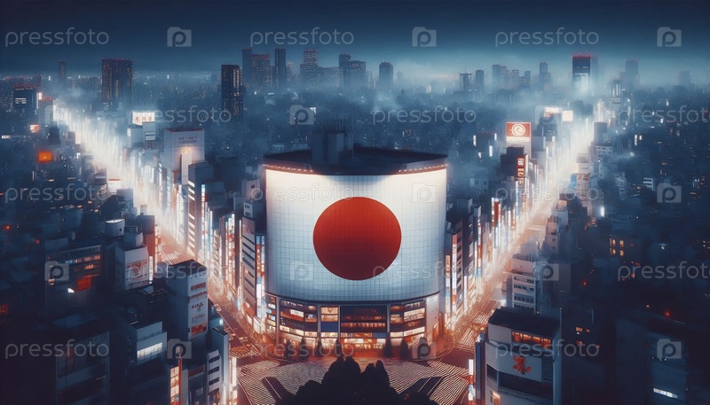 Японский флаг в современных технологиях и неоновом городском ландшафте, Ai generated image