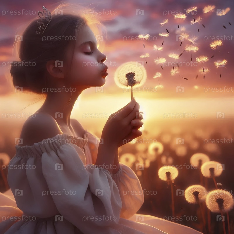 Принцесса, делающая желание на одуванчике акварельный арт-принт, Ai generated image
