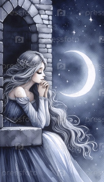 Принцесса, смотрящая на звезды в башне акварельный художественный печат, Ai generated image