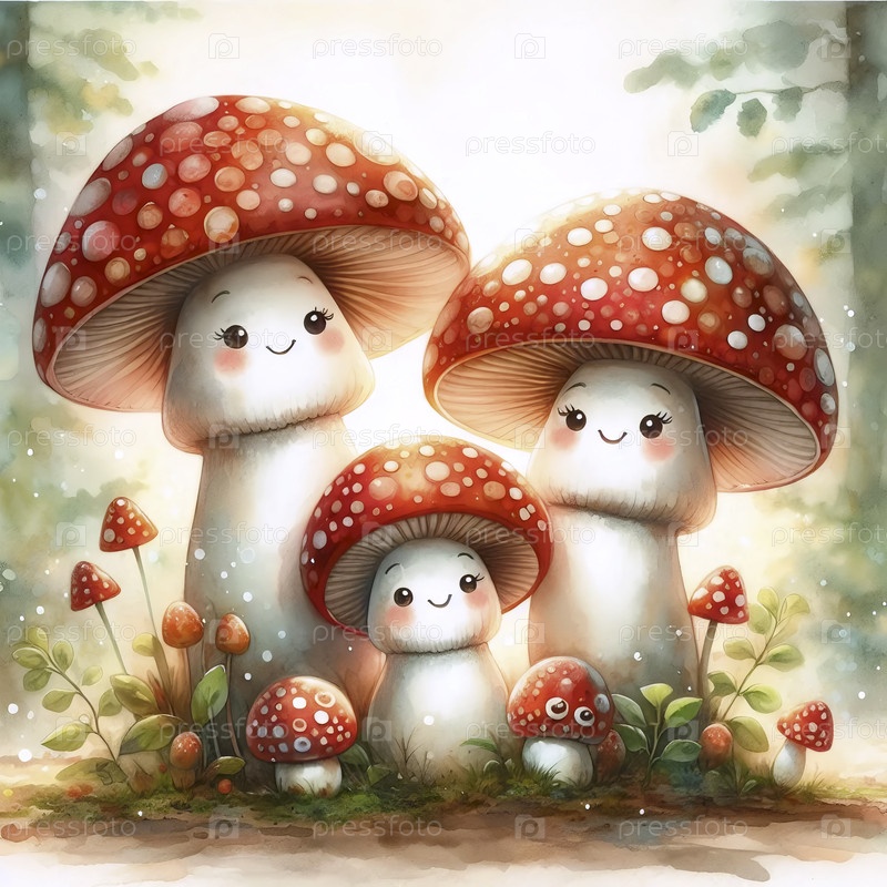 Акварельный арт-принт "Family Mushroom", Ай создал изображение A