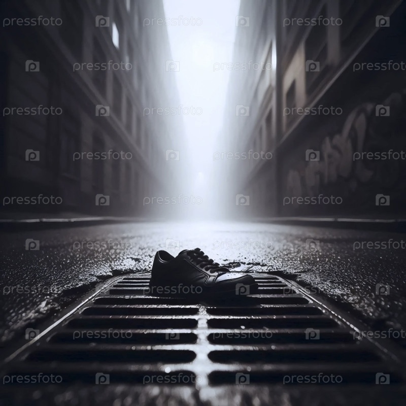 Широкий, атмосферный снимок одинокой обуви на пустой улице Ай создал изображение