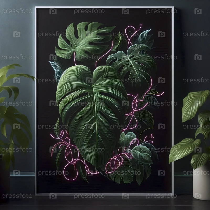 Цифровой неоновый ботанический художественный плакат, Ai generated image