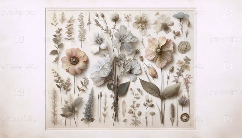 A dried flowers herbarium art print, Ai generated image А сушеные цветы гербария художественная печать, Ай создал изображение