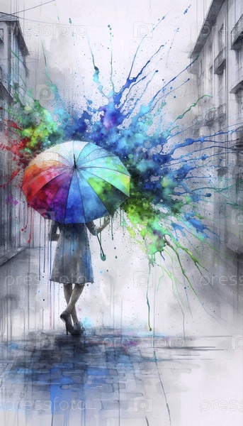 Зонтик под акварельным дождем, Ai generated image