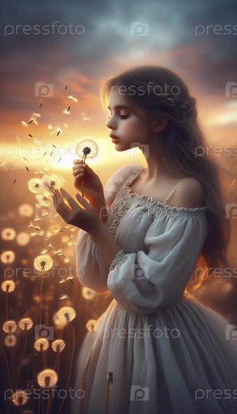 Принцесса, делающая желание на одуванчике акварельный арт-принт, Ai generated image