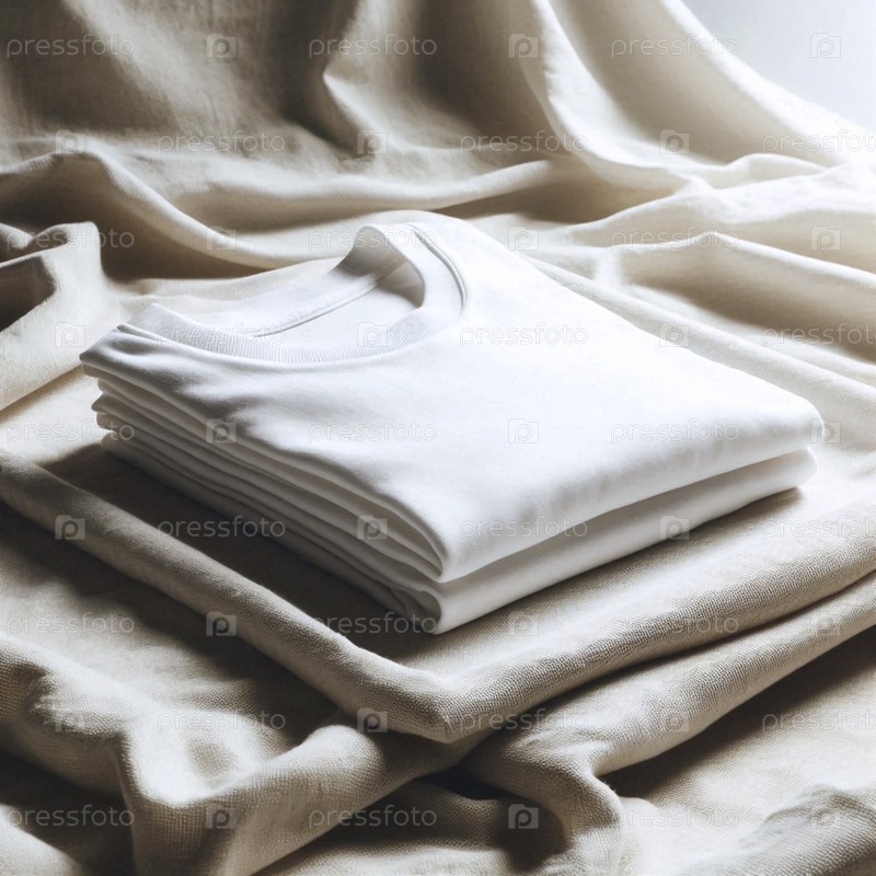Мокет футболок из чистой белой органической хлопковой ткани, нежно сложенный на холсте из конопли, Ai generated image