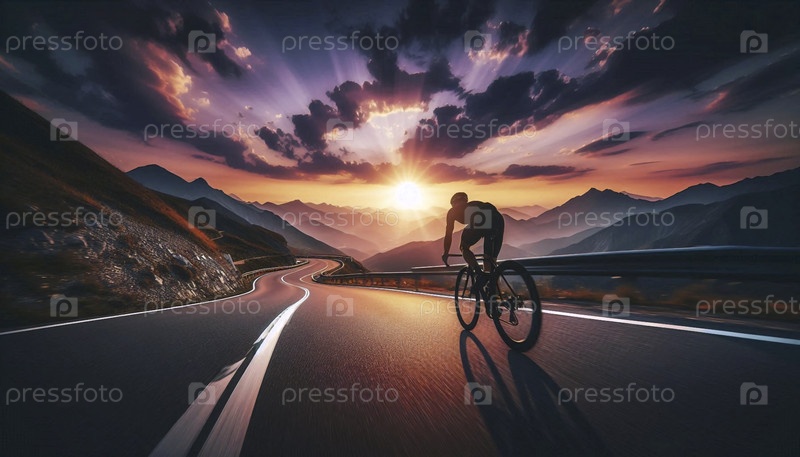 Приключенческий велосипедист покоряет извилистую горную дорогу на закате, оглядываясь назад, Ai generated image
