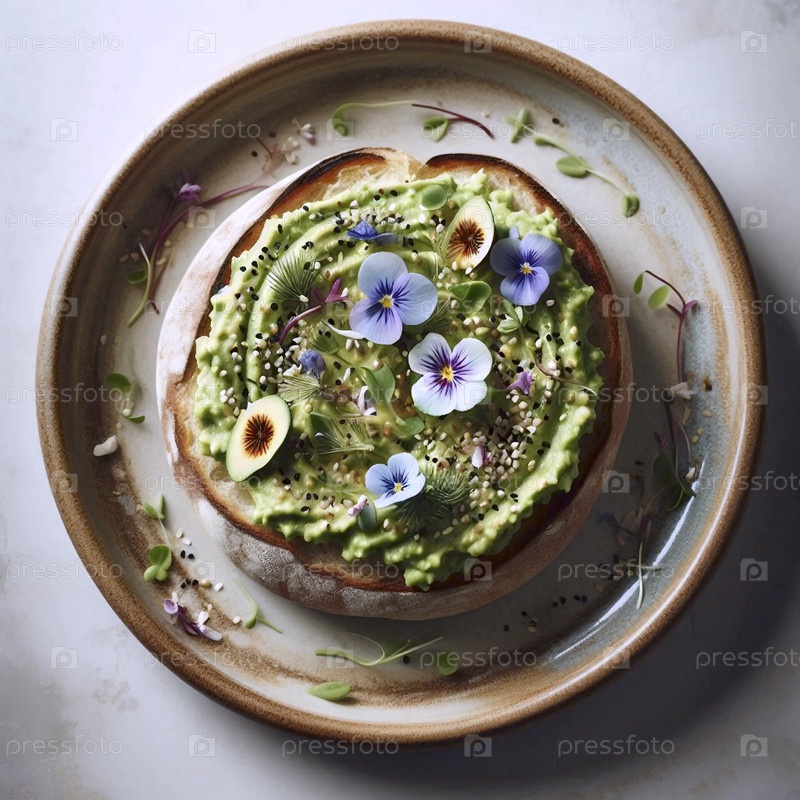 Небольшой круглый тост из авокадо с съедобными цветами и семенами кунжута на ручной керамической тарелке, Ai generated image