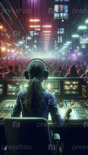 Более широкий кинематографический снимок окружающей среды, сделанный в хаотичной контрольной комнате, пропитанной неоном во время сетевой трансляции, Ai создал изображение