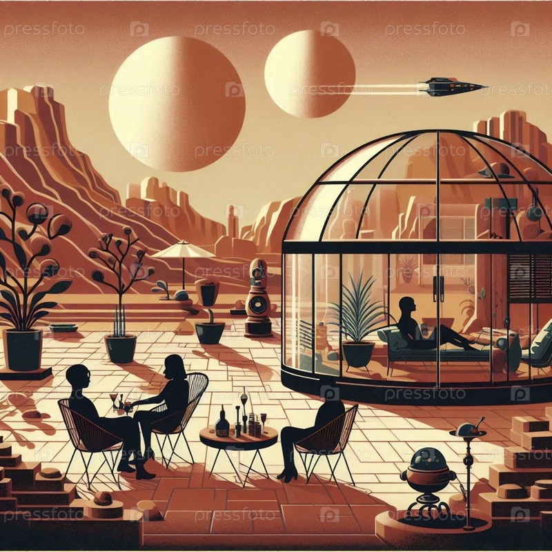 Ретро-футуристическая семья наслаждается заходящим солнцем на пикнике на их марсианском крыльце, Ai generated image
