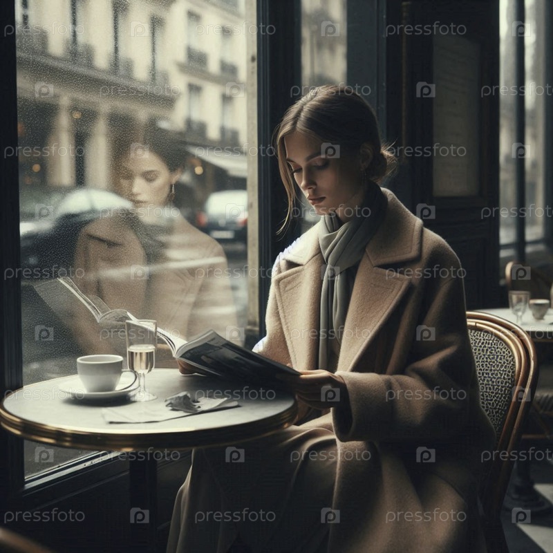 Женщина в верблюжьем пальто в дождливом кафе, Ai generated image