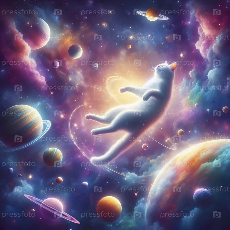 Кошка плавает в космосе с искусством сюрреалистических планет, Ai generated image