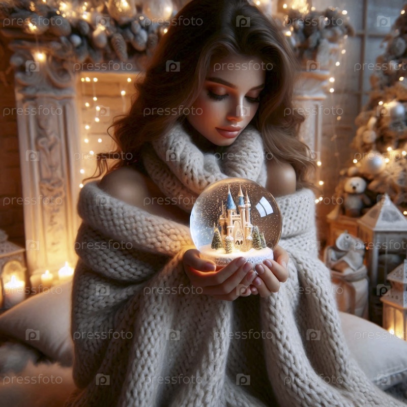 Принцесса со снежным шаром Королевство акварельное художественное печать, Ai generated image