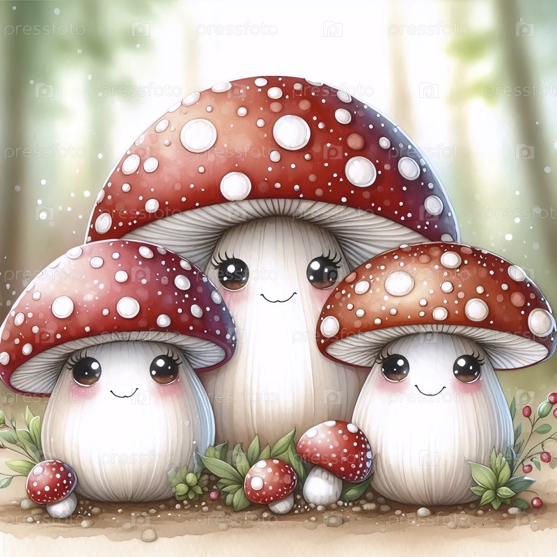 Акварельный арт-принт "Family Mushroom", Ай создал изображение A