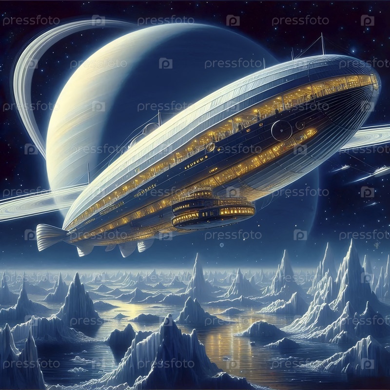 Массивный роскошный космический дирижабль, плавающий по кольцам Сатурна, Ai создал изображение