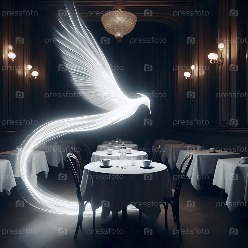 Ангел, взлетающий и тянущий салфетку в пустом кафе, Ai generated image