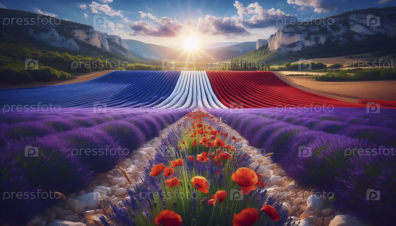 Французский флаг на полях лаванды в Провансе, Ai generated image