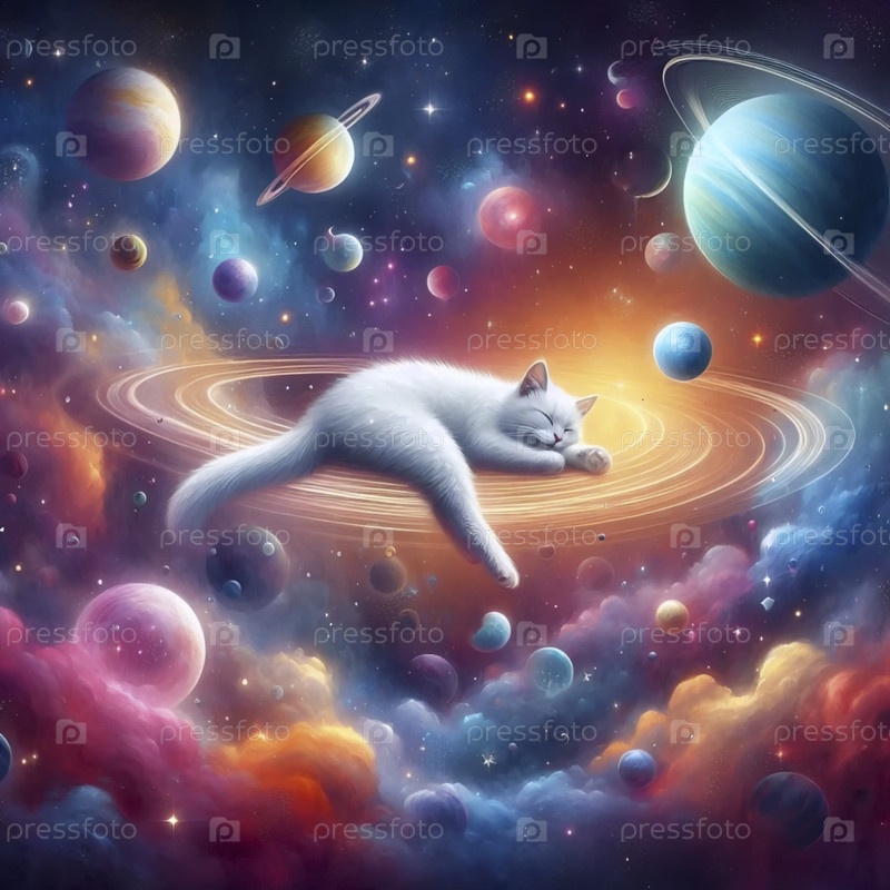 Кошка плавает в космосе с искусством сюрреалистических планет, Ai generated image