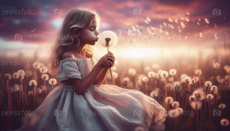Принцесса, делающая желание на одуванчике акварельный арт-принт, Ai generated image