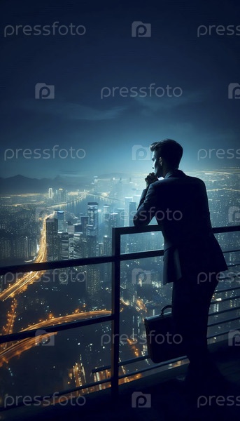 Момент предпринимательских амбиций с видом на яркий, ночной городской пейзаж Ай создал образ