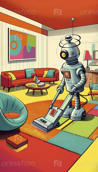 Роботизированный дворецкий с коническим телом, головой радиолокационной тарелки и роликовыми ногами пылесосит затонувшую гостиную