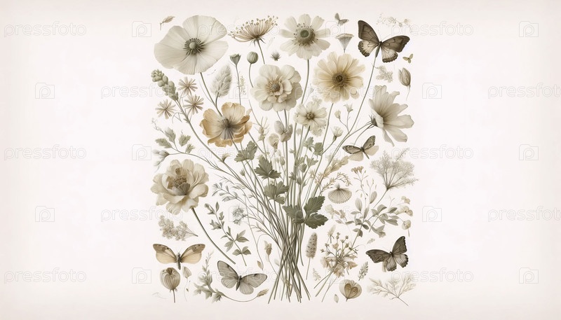 A dried flowers herbarium art print, Ai generated image А сушеные цветы гербария художественная печать, Ай создал изображение