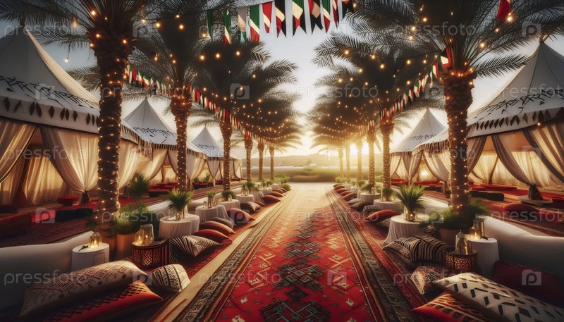 Флаг ОАЭ в пустынном люксовом лагере, Ai generated image
