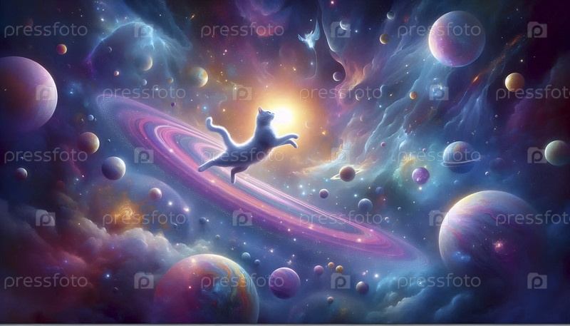 Кошка плавает в космосе с искусством сюрреалистических планет, Ai generated image