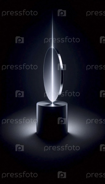 Макет высокой матовой черной цилиндрической колонны в пустом темном пространстве, освещенный вертикальным разрезом света от скрытого источника