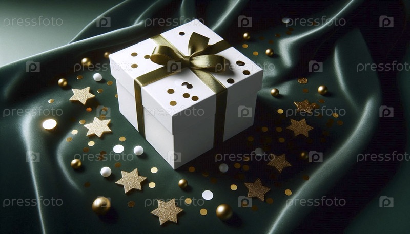 Простой белый макет подарочной коробки, посыпанный металлическими золотыми конфетками на темно-зеленом бархатном фоне, Ai generated image