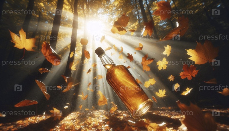 Макет бутылки с золотым оттенком, пойманный в середине осени среди вихревого каскада желтых и оранжевых кленовых листьев, Ai generated image