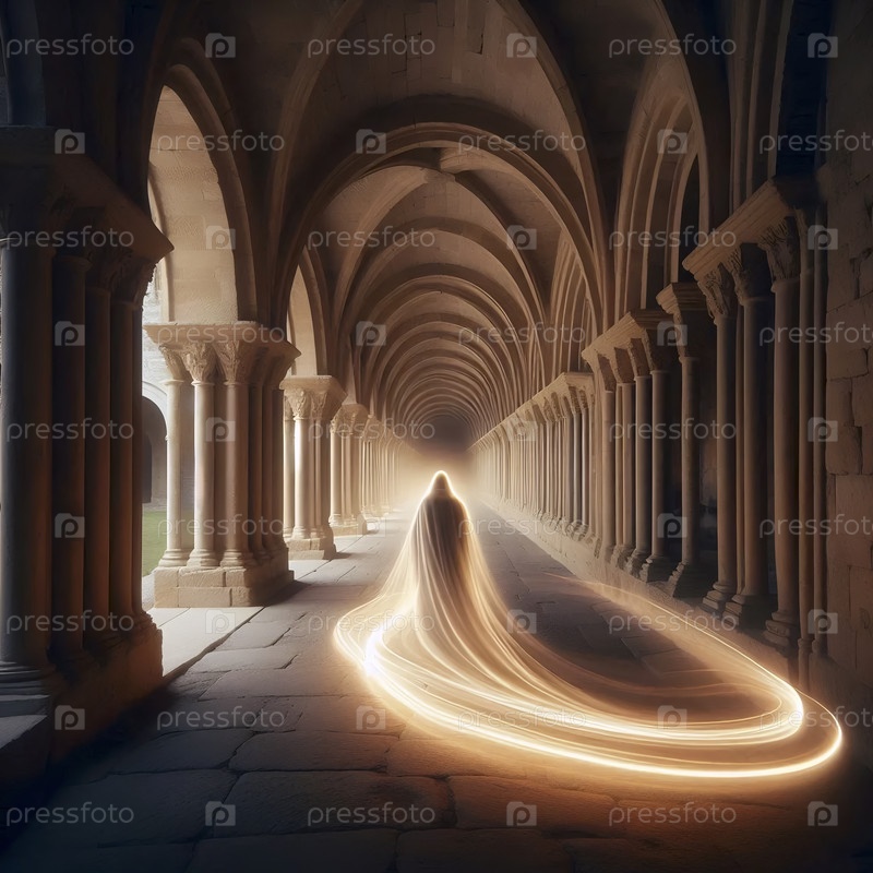 Фотография с длинной экспозицией монаха, идущего по монастырю, Ai generated image
