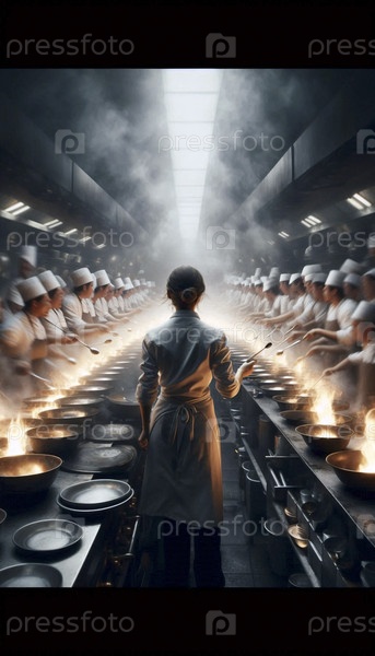 Более широкий кинематографический снимок окружающей среды, сделанный на хаотичной промышленной кухне, заполненной паромом во время обеда, Ai generated image