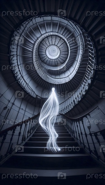 Фотография с длинной экспозицией фигуры, поднимающейся по спиральной лестнице, Ai generated image