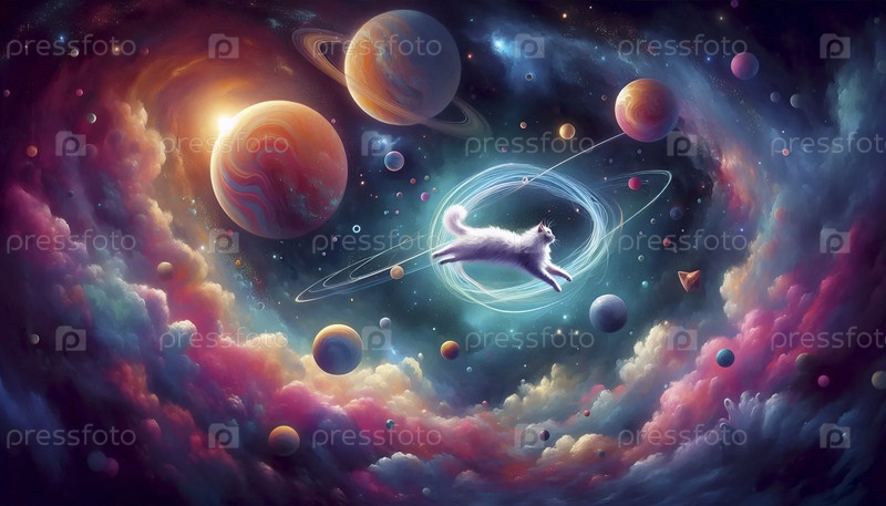 Кошка плавает в космосе с искусством сюрреалистических планет, Ai generated image