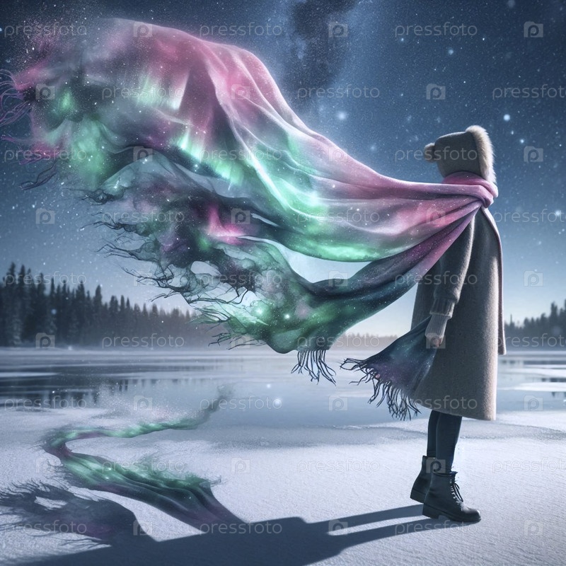 Шаль, превращающаяся в акварельное полярное сияние, Ai generated image