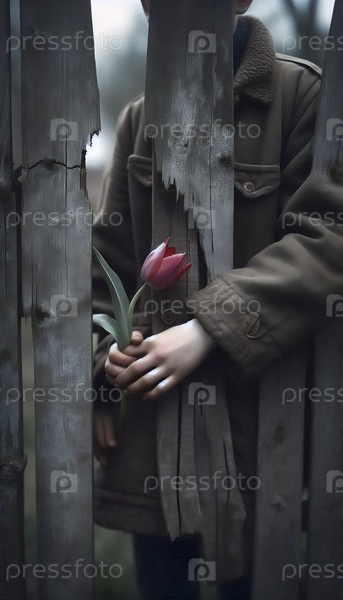 Мальчик переносит тюльпан через сломанный забор, Ai generated image