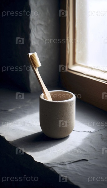Мокет зубной щетки из бамбука, стоящий прямо в простой сырой глиняной чашке на стеклянном подоконнике, Ai generated image