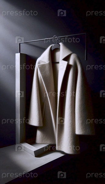 Мокет бежевого кашмирного пальто, обтянутый минималистичным бетонным вешальником, Ai generated image